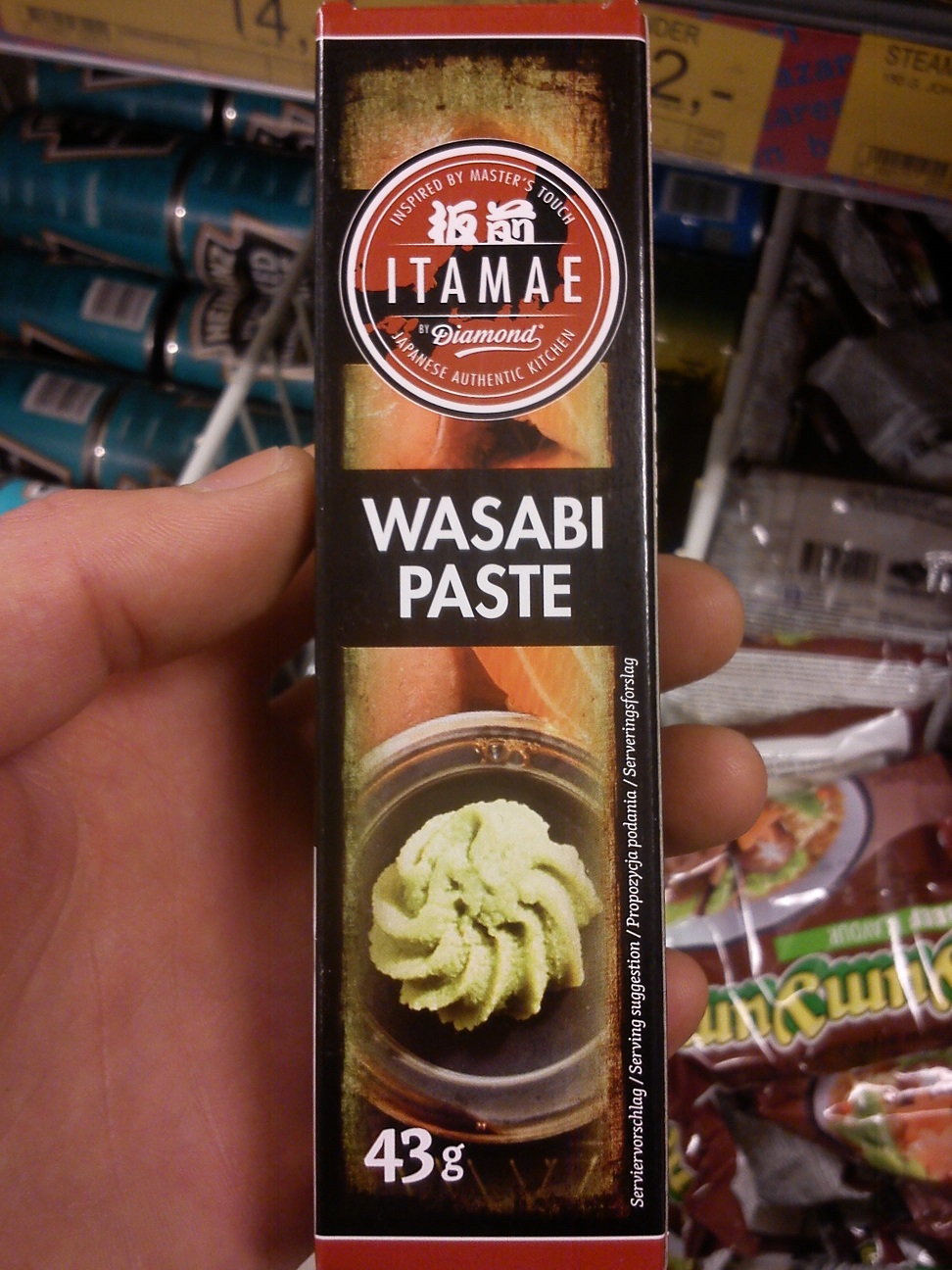 Derudover vil jeg gøre opmærksom på mine erfaringer med wasabi. Umiddelbart bør der ikke være animalske produkter i wasabi, men jeg har fundet tuber med wasabi pasta, som indeholdte laktose (sukkerstof i komælk). Så sent som i går fandt jeg en tube i fakta, som indeholdte laktose.