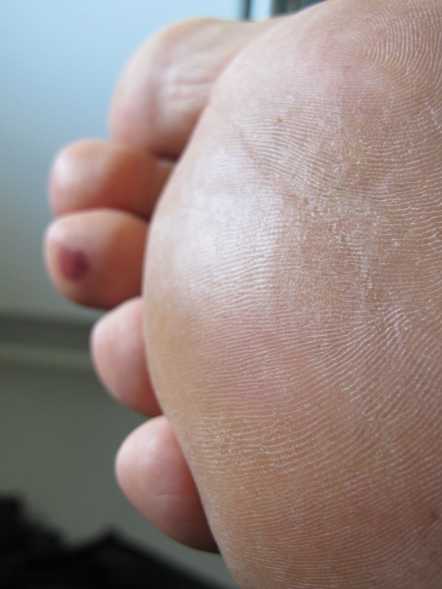 Fødderne har det fint, kun midtertåen på højre fod fik en lille hudblødning. Det er ingenting i forhold til mine fødder, da jeg startede mit barfodseventyr omkring 2010, se billedet på nowa.dk, og læg mærke til, at det er samme tå, der kom til skade dengang.